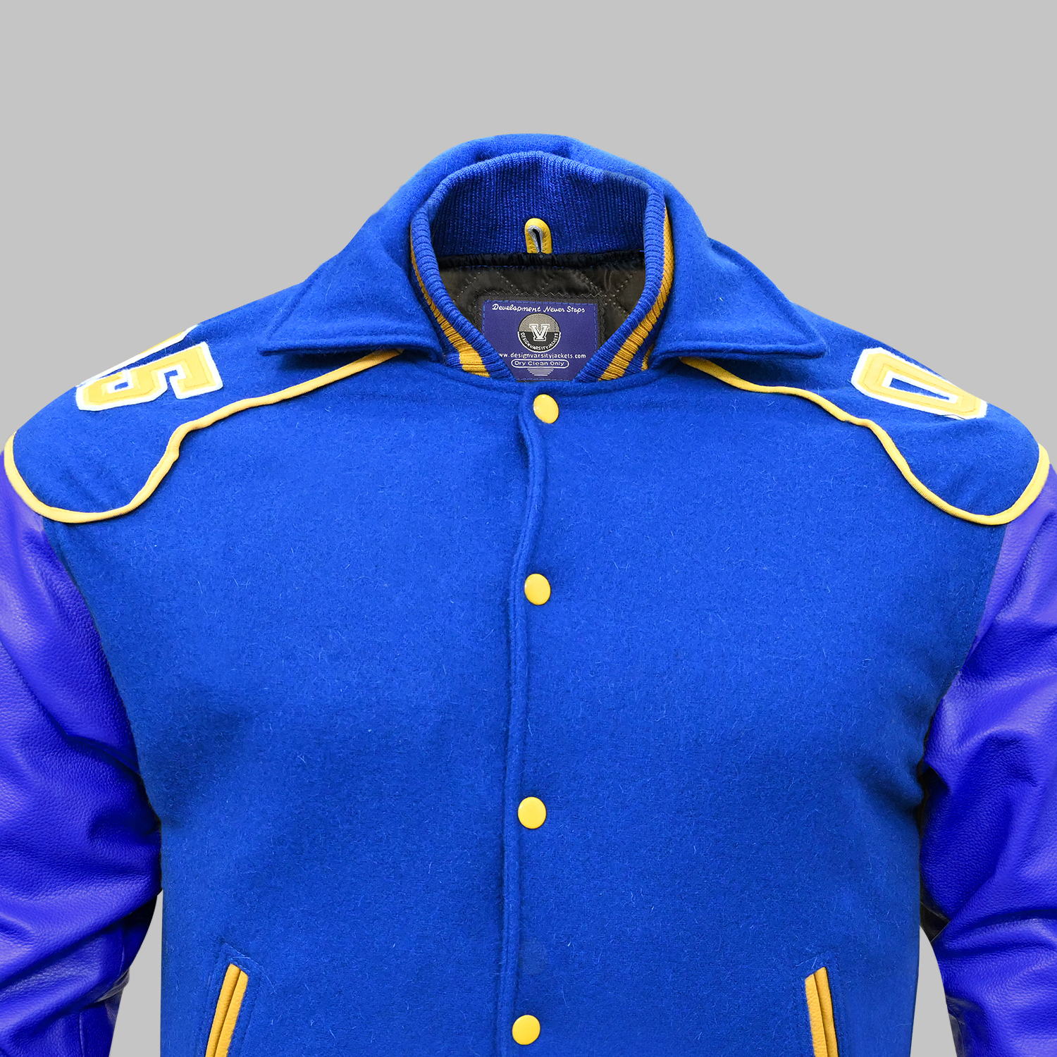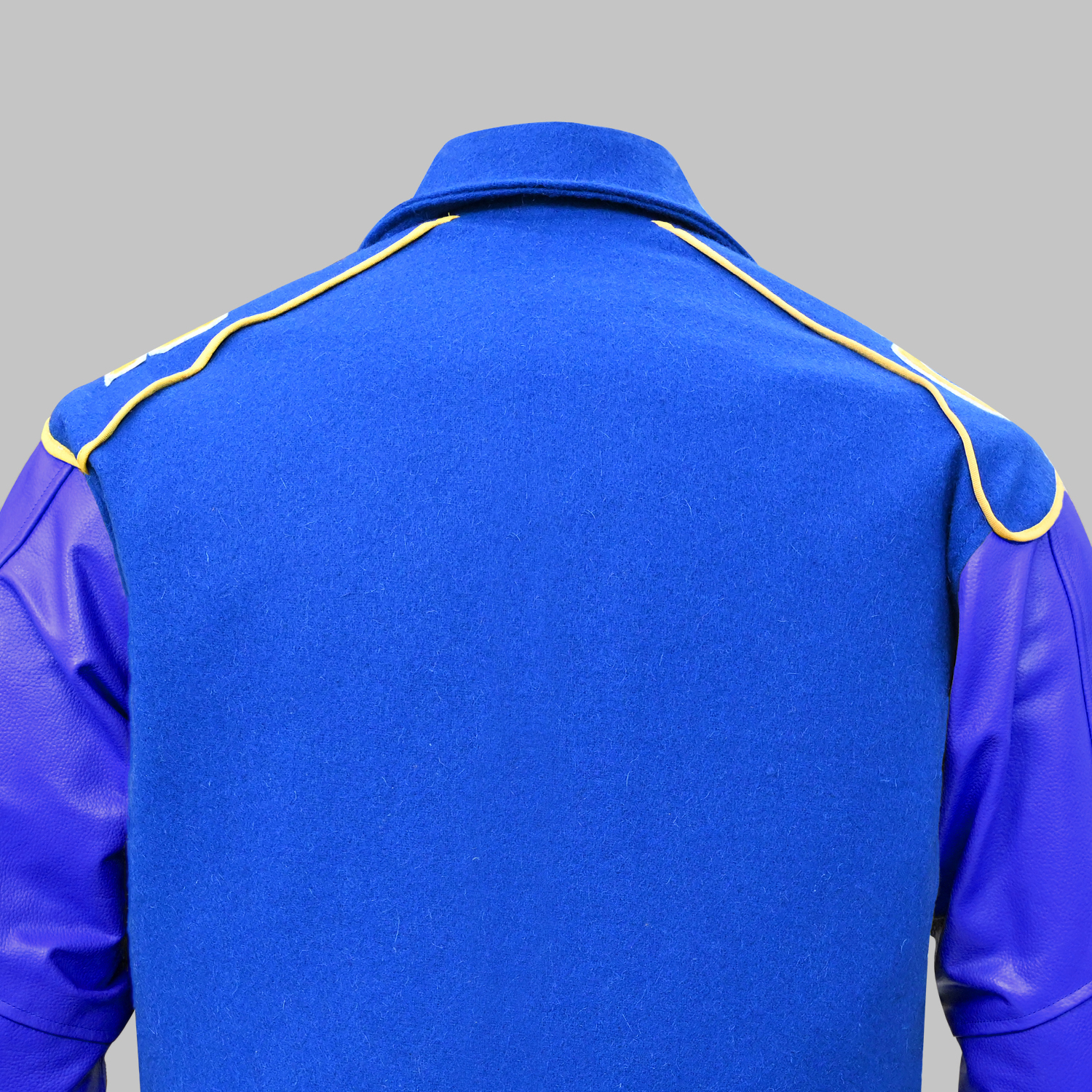 Our Blue Varsity Double Collar Jacket program is optimized for bulk, wholesale, and large-scale production.