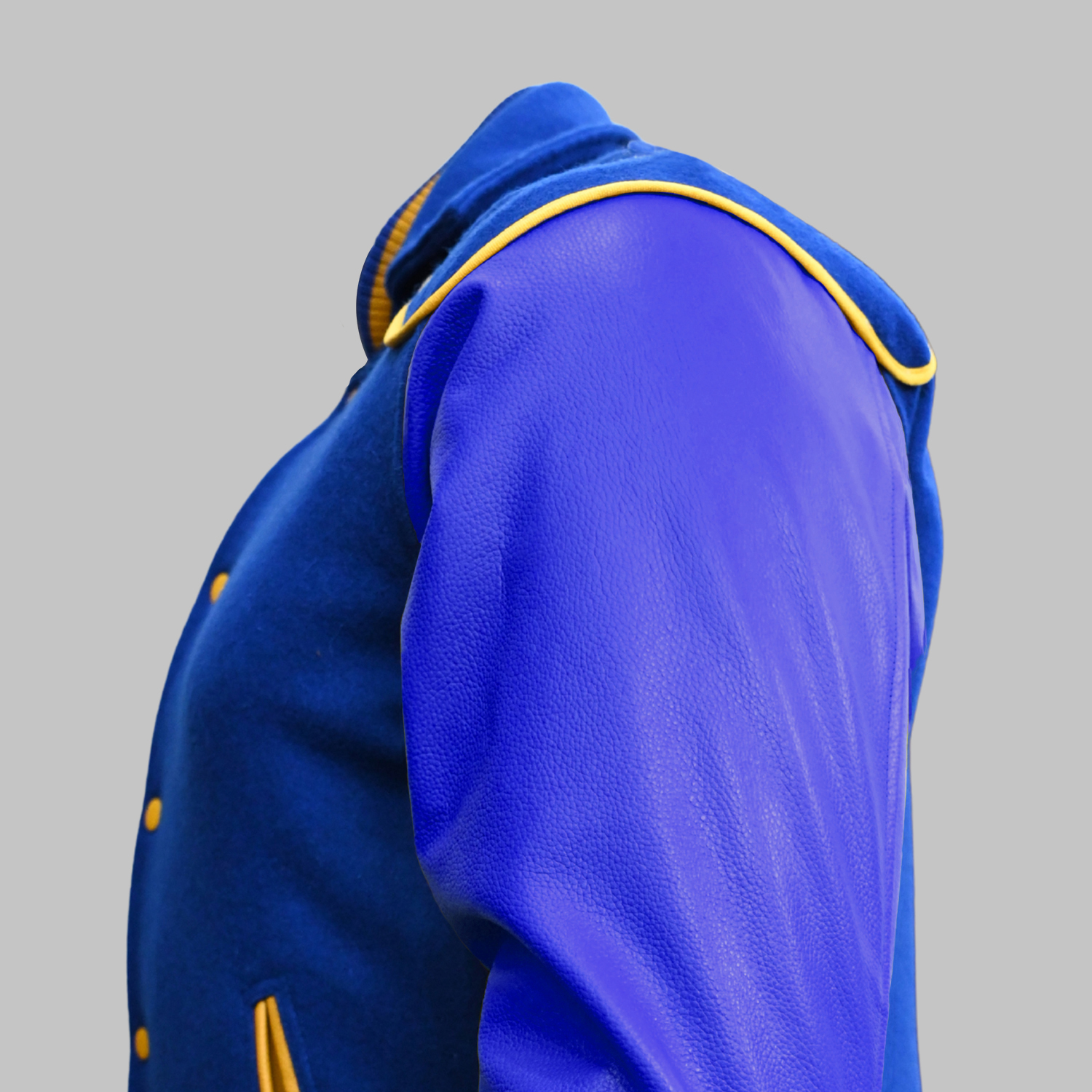 Using our build-your-own customization system, you can personalize every detail—from chenille letters and embroidery to colors, materials, patches, and fit. Whether you’re representing a school, team, brand, or personal style, this custom blue varsity double collar jacket delivers unmatched craftsmanship, comfort, and visual impact.