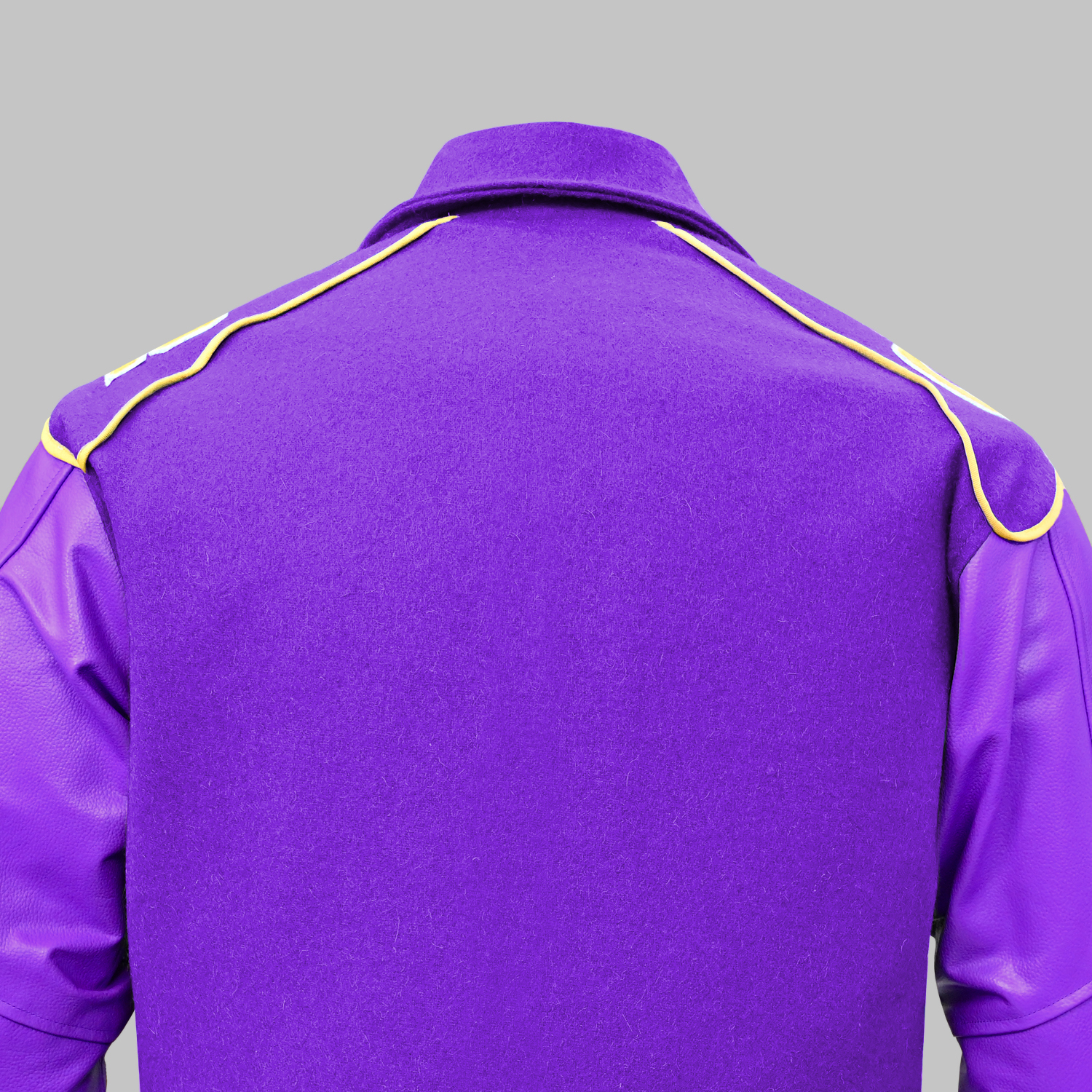 The Purple Letterman Double Collar Jacket transitions seamlessly from casual fashion to professional team uniforms and branded merchandise.